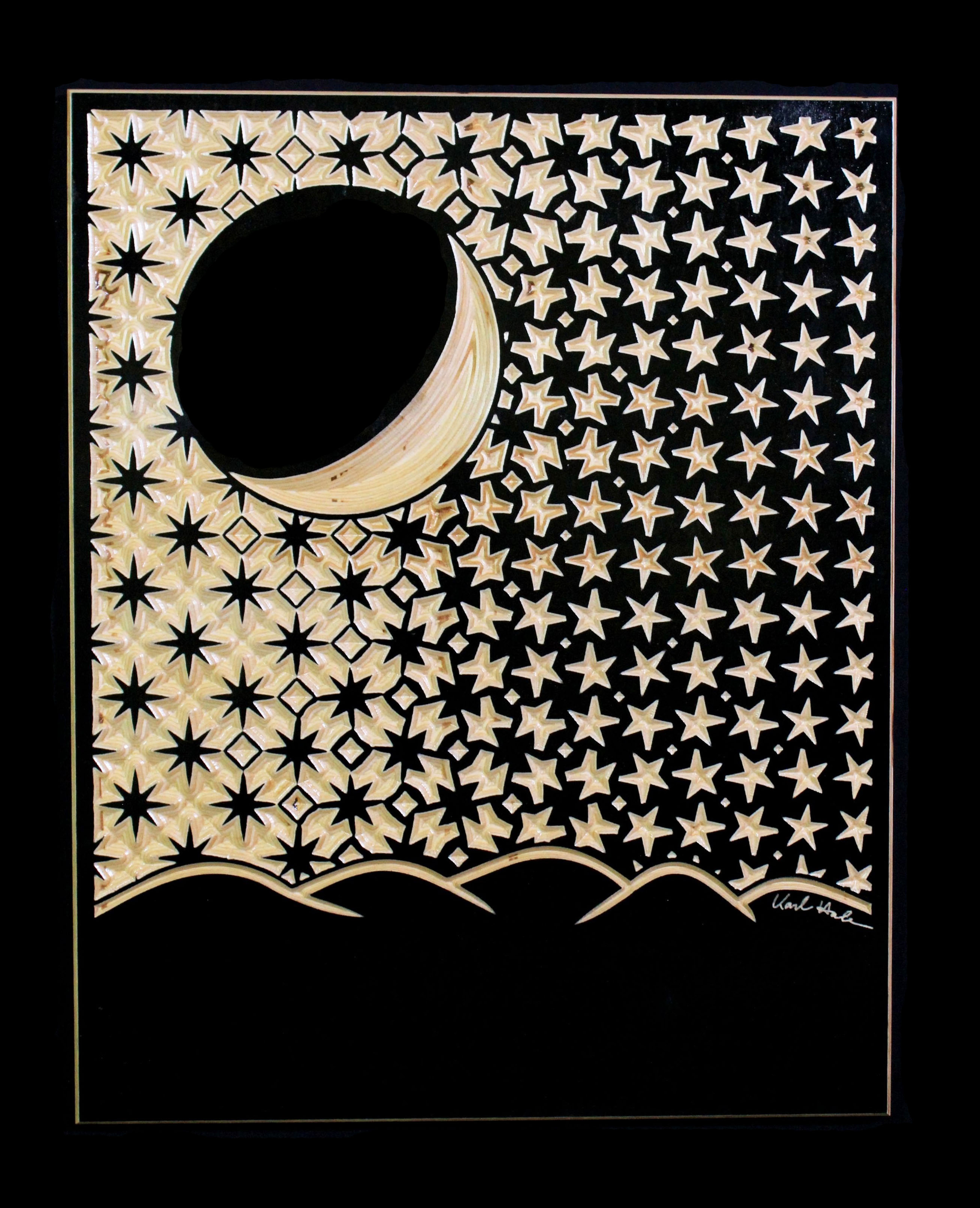 Tessellation, as used in the context of art, refers to the repeated geometric arrangement of shapes. A transformation occurs when the shapes are tweaked slightly throughout the pattern. “Night Life” shows both, as different star shapes dance across the night sky over a divided landscape.
