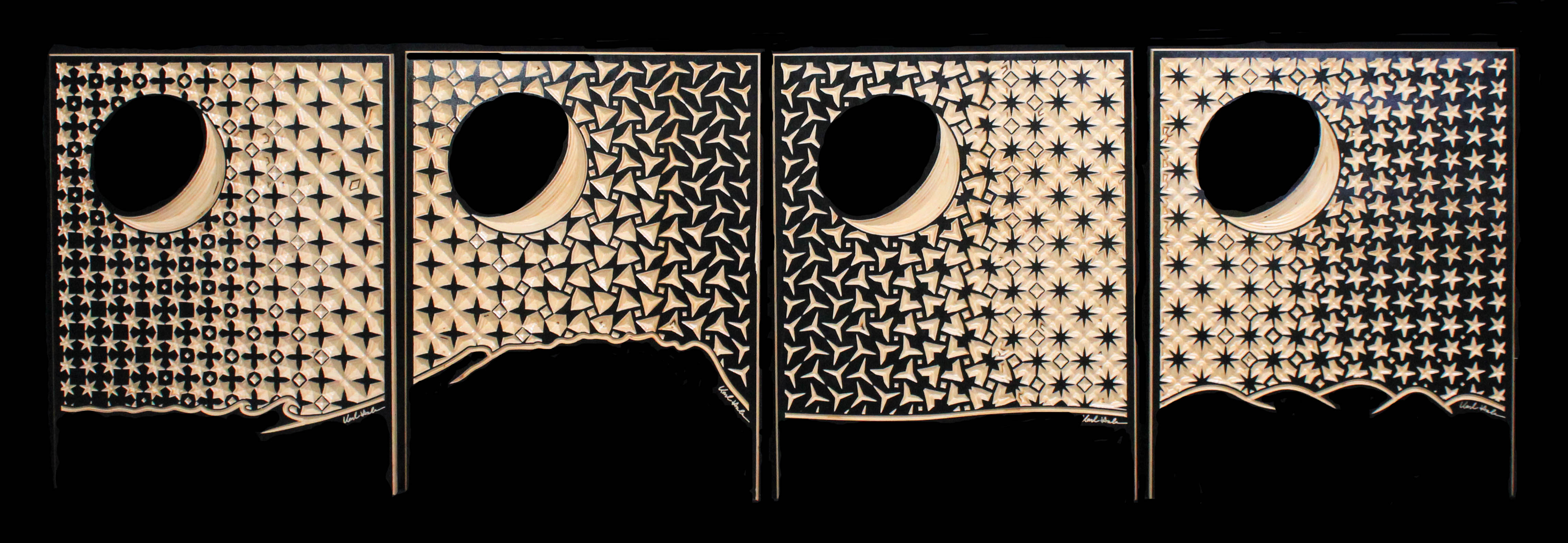 This set of four panels features one long transformation across four different star shapes and back again. Each panel shows one set of stars in the carved wood and the second set in the painted wood; the negative space of the one becoming the positive space of the other.