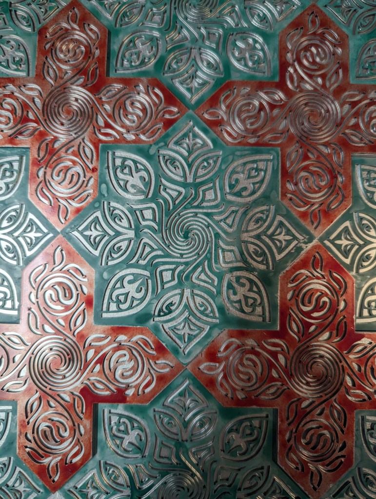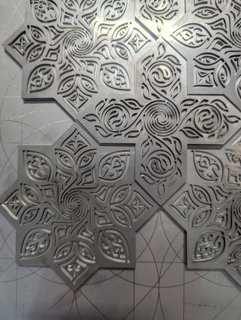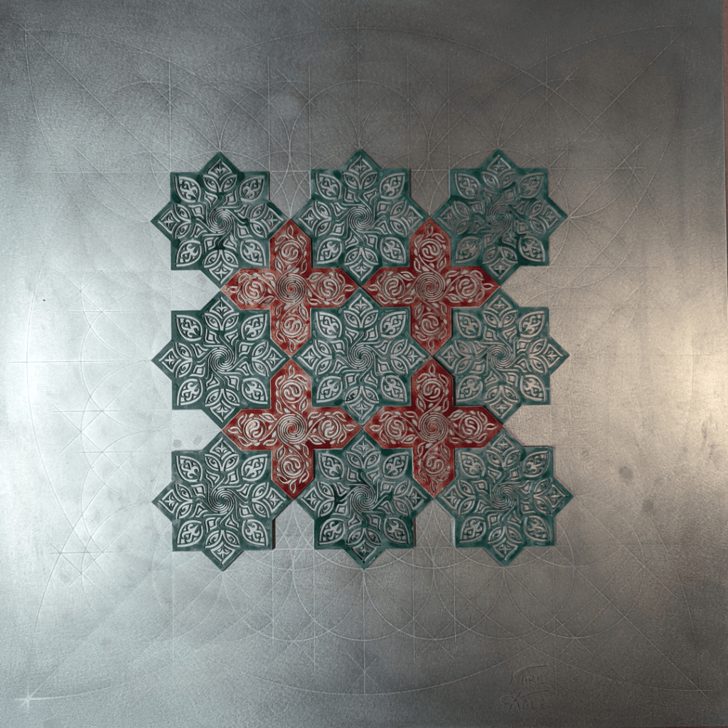 Creating “Approaching the Compassionate” in metal filled a need in my soul. This piece, inspired by the ancient pattern of the compassionate breath, features scribe marks in the background that outline how to make the design with just a compass and straight edge. The intricate tile designs pay homage to Islamic tile work.