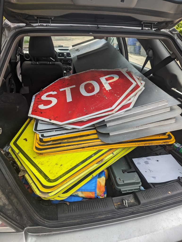 I salvaged these signs from being melted down after they were deemed unfit for their posts because of tagging, wear and tear, and bullet holes. When left untouched, each discarded street sign seems to have reached the end of its usefulness. Yet, when these signs are brought together, they undergo a remarkable transformation into a vibrant work of art.