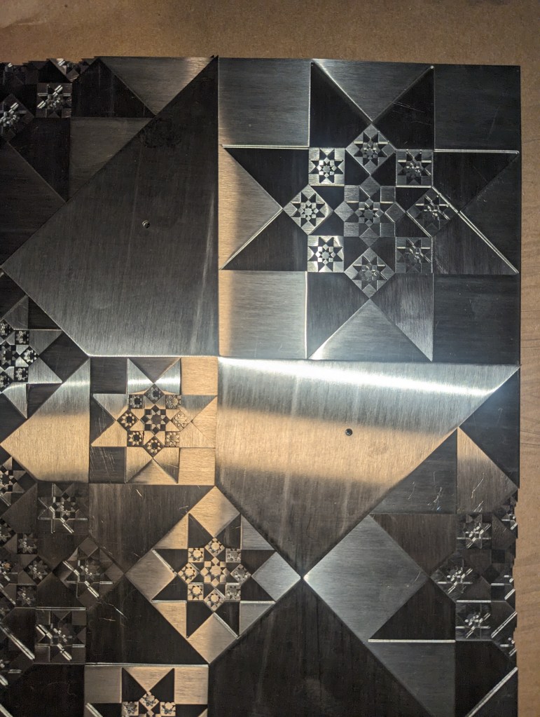 “Little Christs” is built around the two possible regular octagrams (8-pointed stars), which represent Christ. Nested inside and tucked around, the pattern is repeated fractal-like throughout the ten layers in various sizes. We are those Little Christs, both becoming the body of Christ and becoming like Christ.