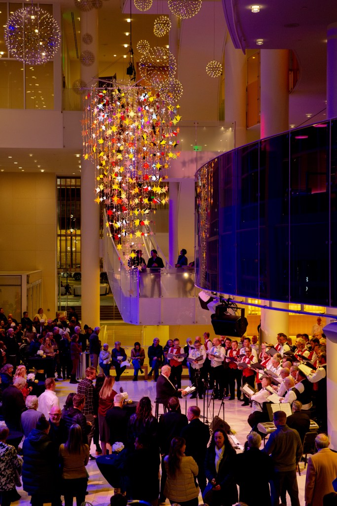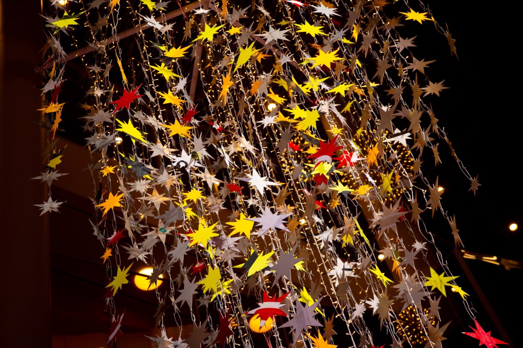 “Starfall” is created from 600 stars cut from recycled traffic signs salvaged in Salt Lake City. It symbolizes the transformation of discarded, scarred materials into a radiant display of beauty. “Starfall” also reflects humanity’s resilience and the everyday beauty of individuals.