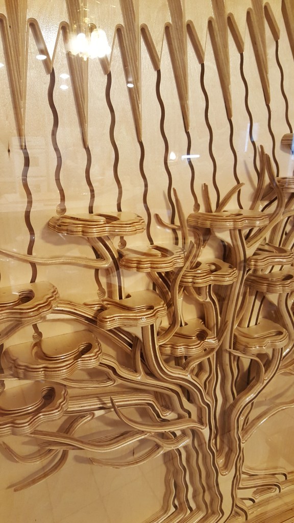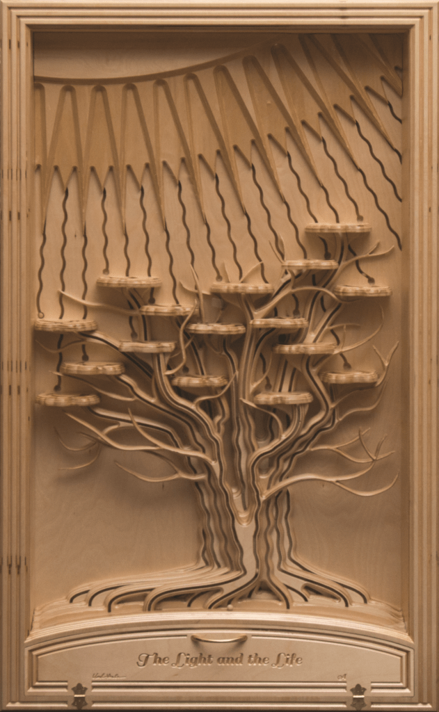 “The Light and The Life” serves as a poignant reminder that the light of the world is, quite literally, the life of the world. The piece is powered by two motors and is engineered to continuously drop wooden marbles down intricately carved trails from the sun to the tree.