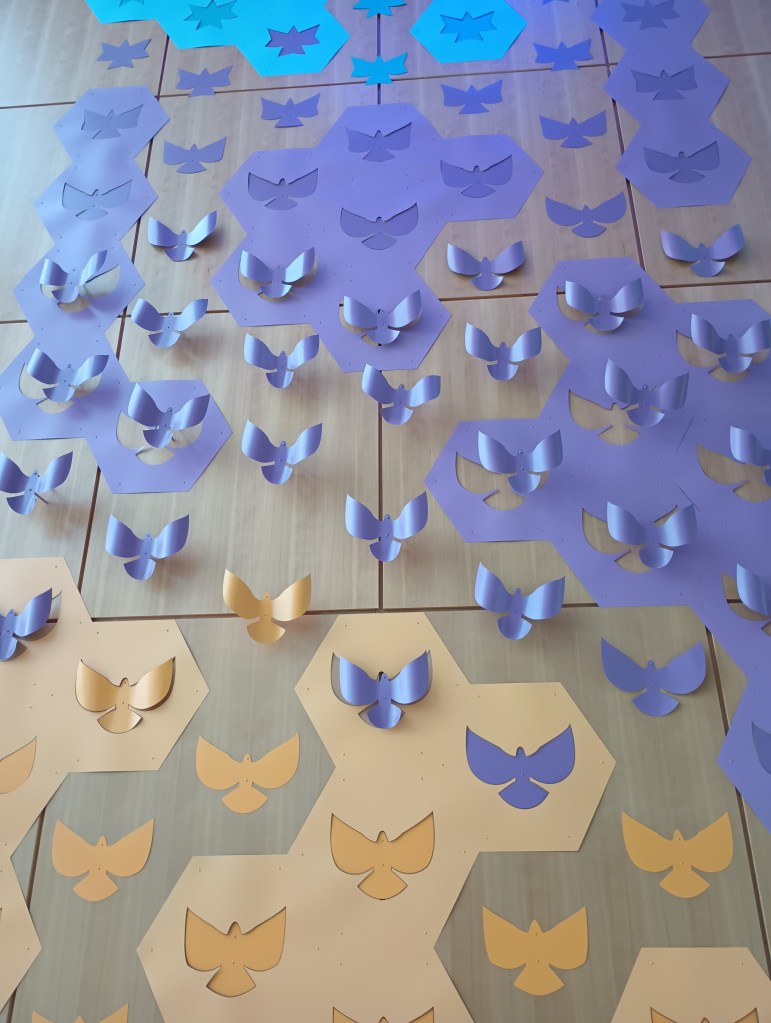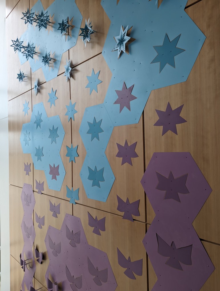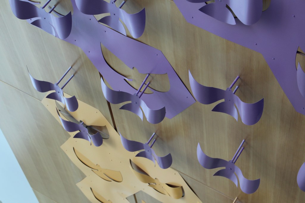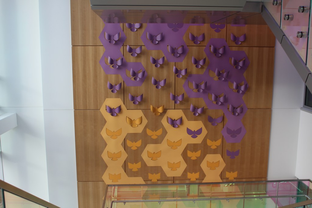 The 45-foot installation features laser-cut colorful aluminum flowers that gracefully transform into birds and then further evolve into stars as visitors climb the main staircase of Primary Children’s Hospital. “Transcend” blends playfulness with the symbolism of hope in the journey towards healing.