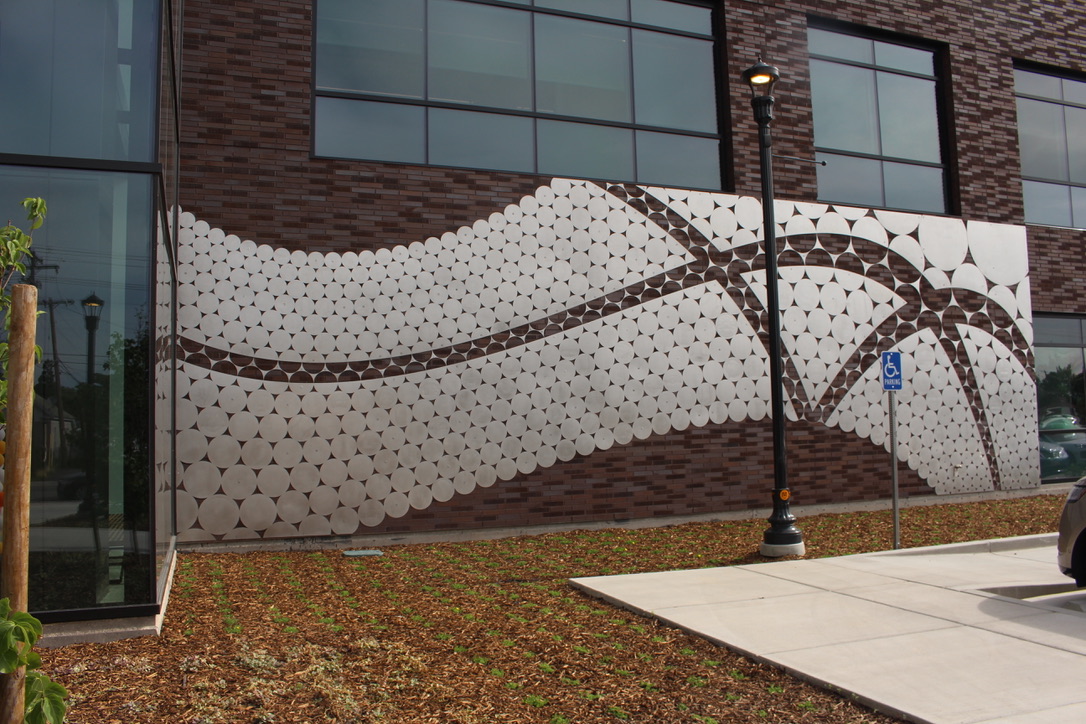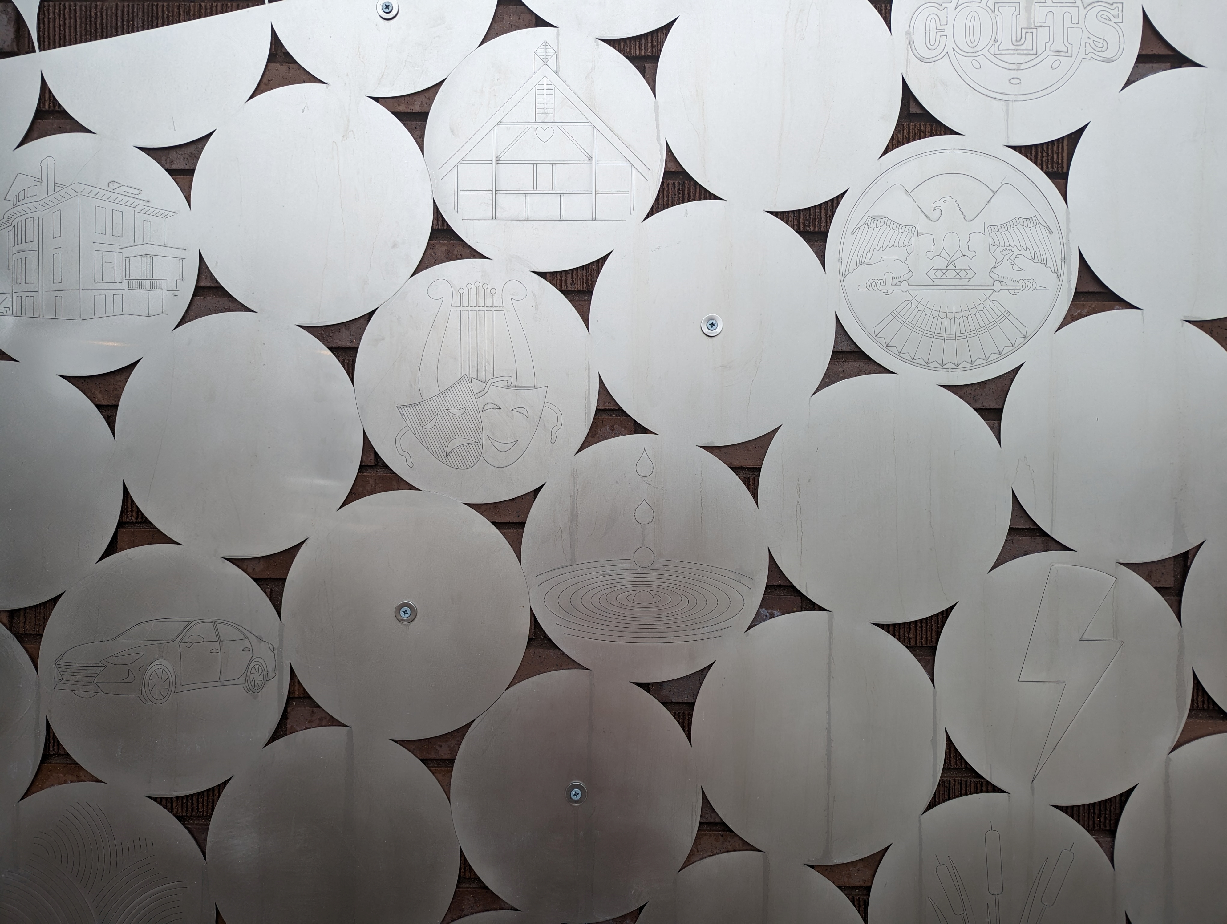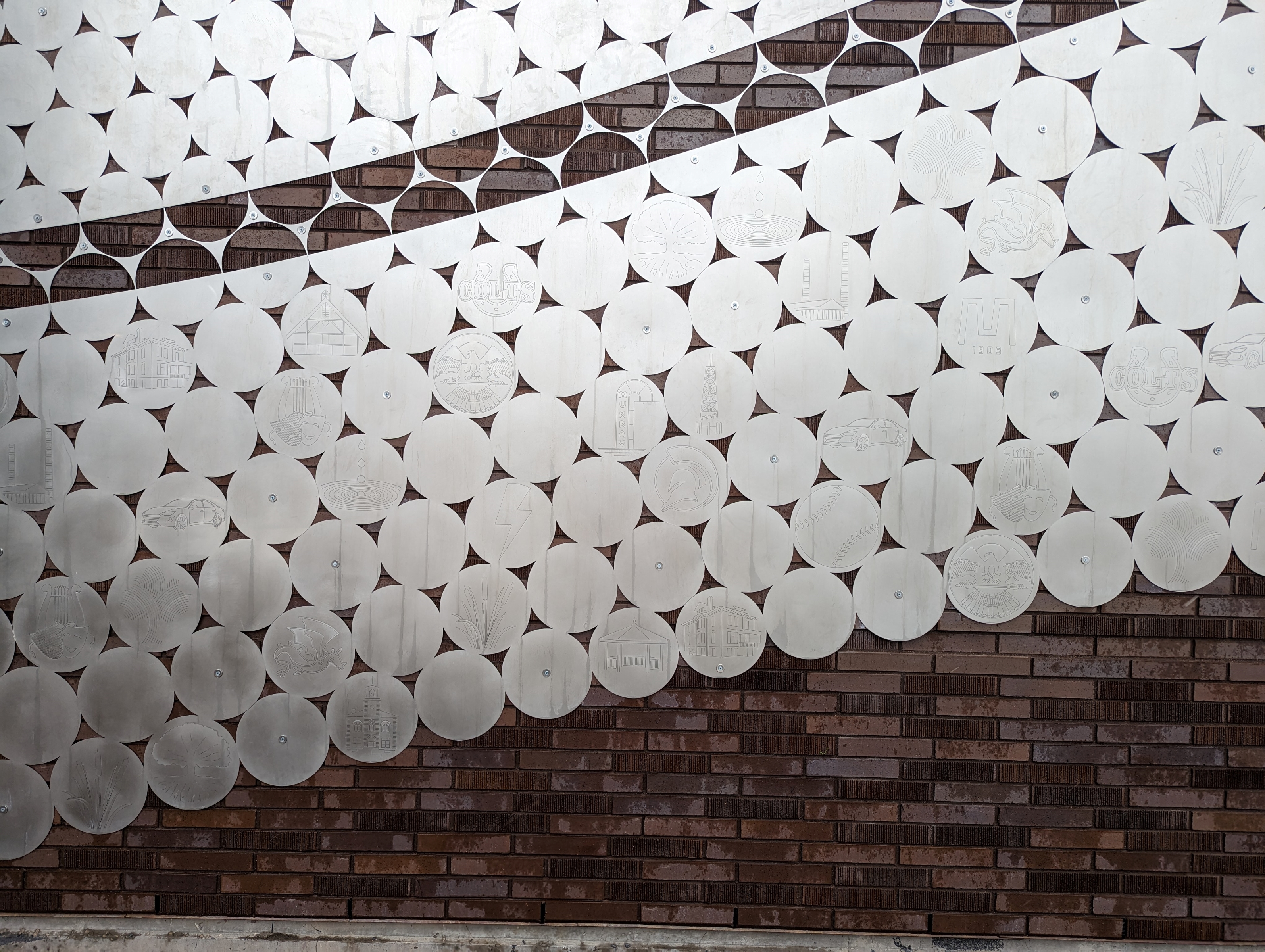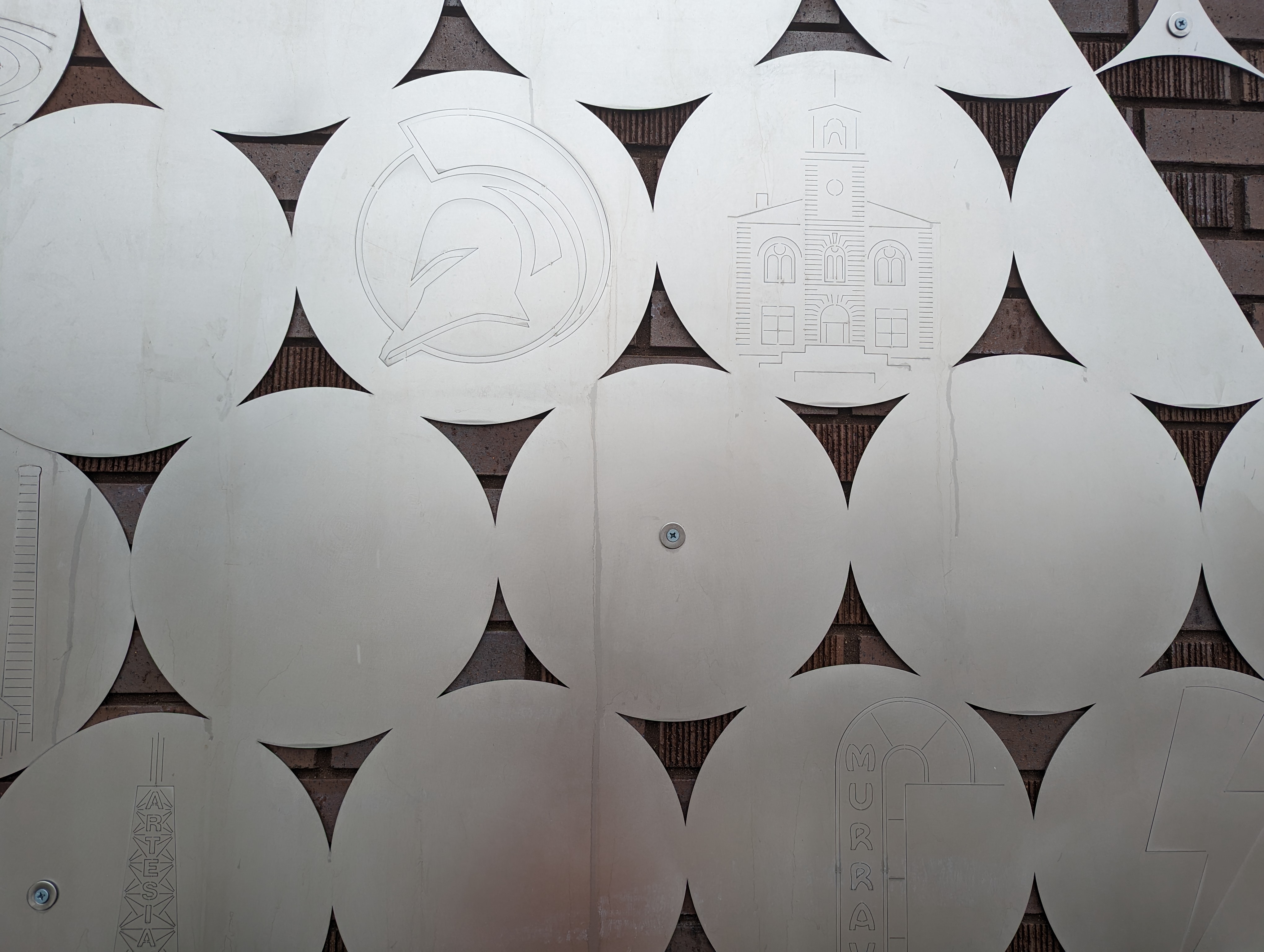 “Unfettered Unity” celebrates Murray’s heritage through hundreds of metal circles etched with historic and tribal symbols. Viewed from further away, the circles map out Murray’s main waterways, but on closer inspection, line drawings of landmarks, school logos, and native flora appear.